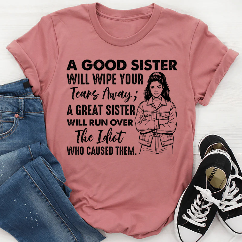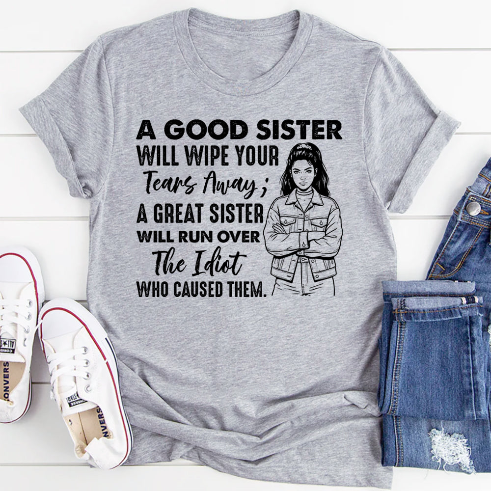 Funny, bold, and unapologetically real. The “A GOOD SISTER WILL WIPE YOUR TEARS AWAY; A GREAT SISTER WILL RUN OVER THE IDIOT WHO CAUSED THEM” t‑shirt is a hilarious tribute to the fierce sibling who doesn’t just comfort—they protect… with style. It blends humor with a touch of truth, making it perfect for anyone who knows a sister’s love comes with a side of badassery.