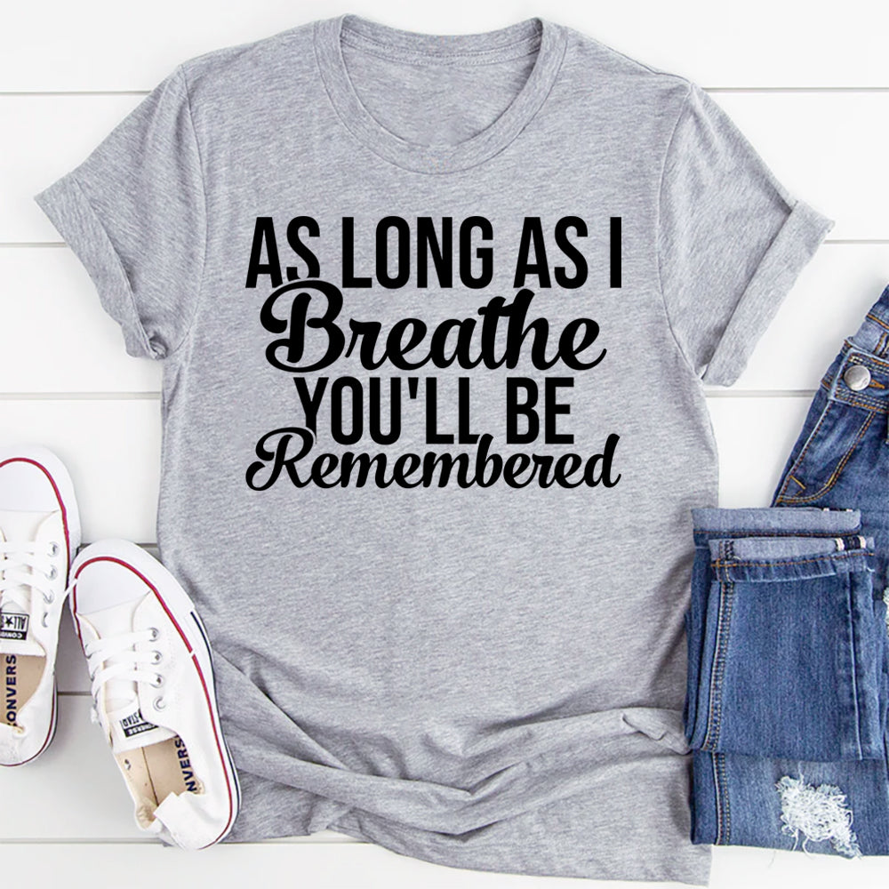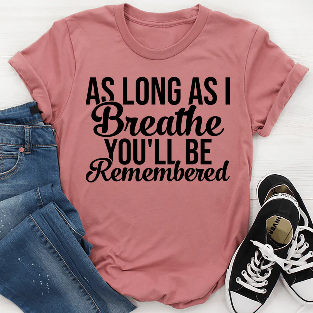 Heartfelt, bold, and deeply meaningful. The “As Long As I Breathe, You’ll Be Remembered” t‑shirt delivers a powerful tribute with just the right touch of emotion. Perfect for anyone who wants to honor the memory of someone special and keep their spirit alive.