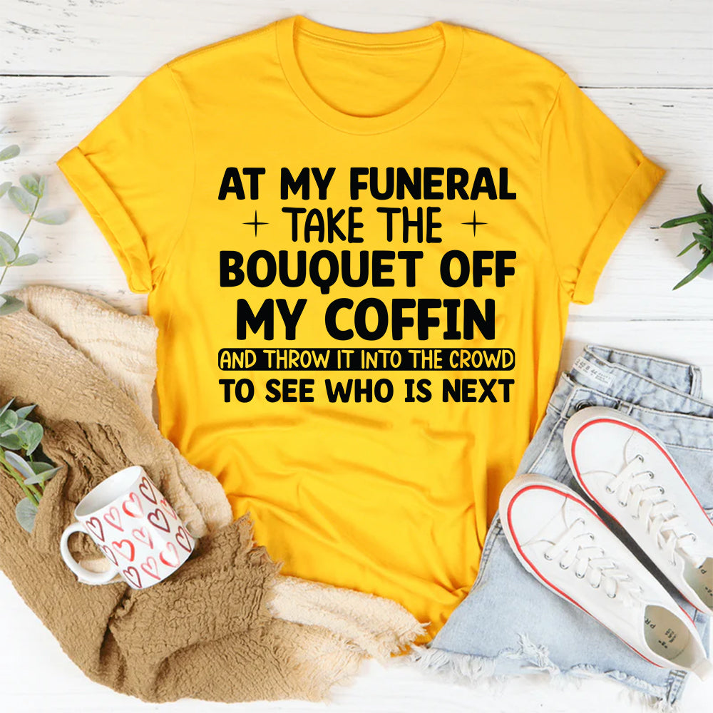 Dark humor, bold sarcasm, and unforgettable attitude. The “At My Funeral, Take the Bouquet Off My Coffin and Throw It Into the Crowd to See Who Is Next” t‑shirt is made for those who embrace morbid humor and aren’t afraid to shock with a laugh. It delivers edgy wit with confidence, turning dark comedy into a statement piece.