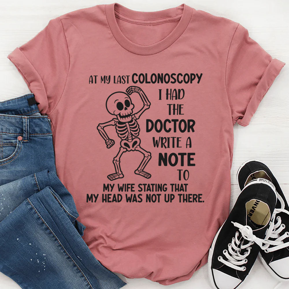Proof at last. The “At My Last Colonoscopy I Had the Doctor Write a Note to My Wife Stating That My Head Was Not Up There” t-shirt delivers big laughs with its outrageous punchline. Perfect for anyone who loves crude humor and isn’t afraid to wear it proudly, this tee is guaranteed to get attention (and chuckles).