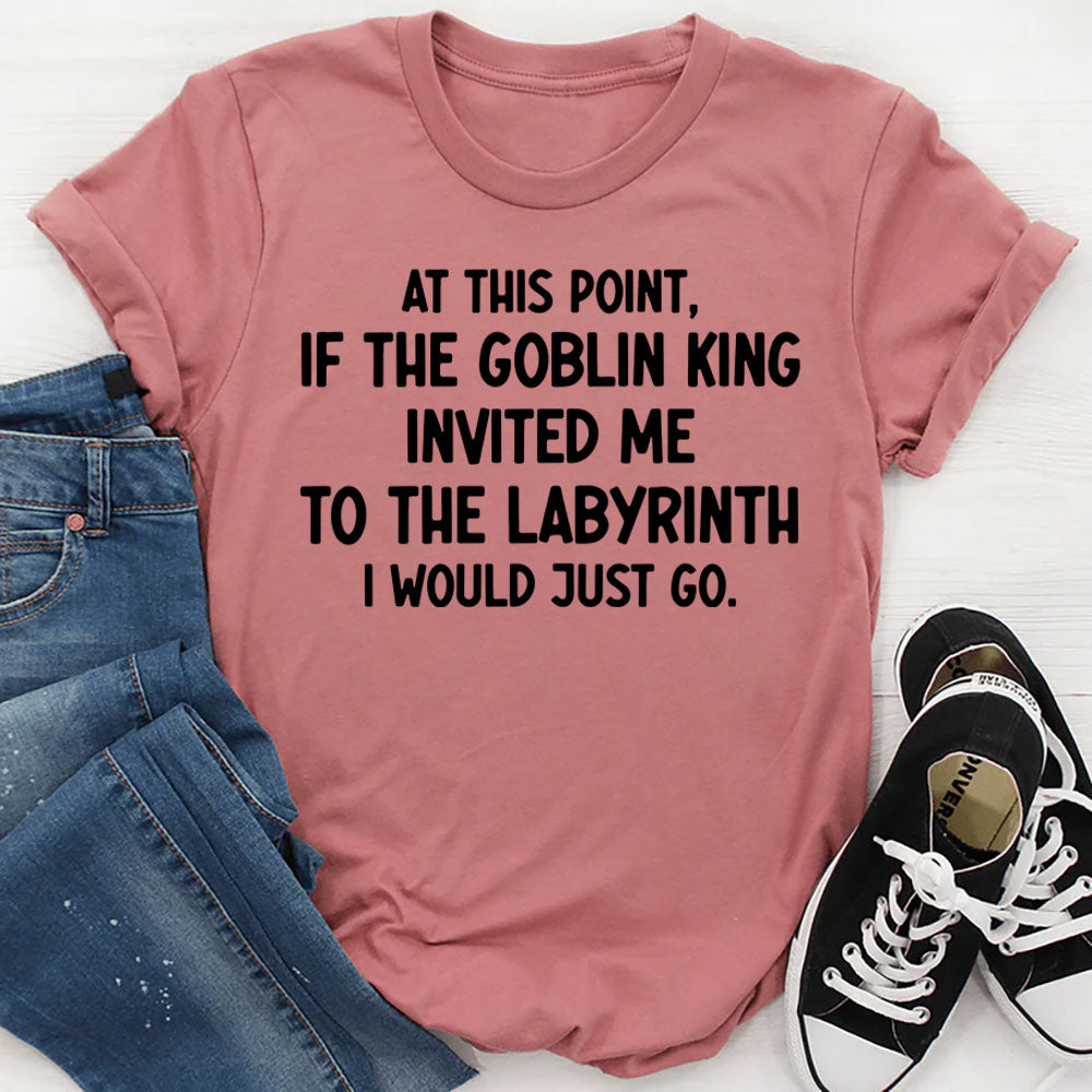 Let your love for fantasy and humor shine with this “At This Point If the Goblin King Invited Me Labyrinth I Would Just Go” t-shirt. Playful, nerdy, and a little bit escapist, this tee is perfect for fans of classic fantasy films or anyone ready to ditch reality for a magical adventure.