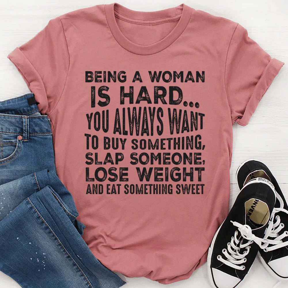 Keep it real with the “Being a Woman Is Hard” t-shirt. Featuring the hilarious truth—wanting to buy something, slap someone, lose weight, and eat something sweet all at once—this tee captures the daily struggles and humor of womanhood perfectly.