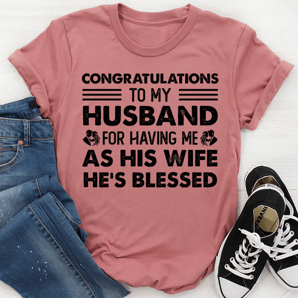 Playful, confident, and full of personality. The “Congratulations to My Husband for Having Me as His Wife — He’s Blessed” t-shirt delivers humor with a healthy dose of self-love. Perfect for wives who know their worth and aren’t afraid to celebrate it.