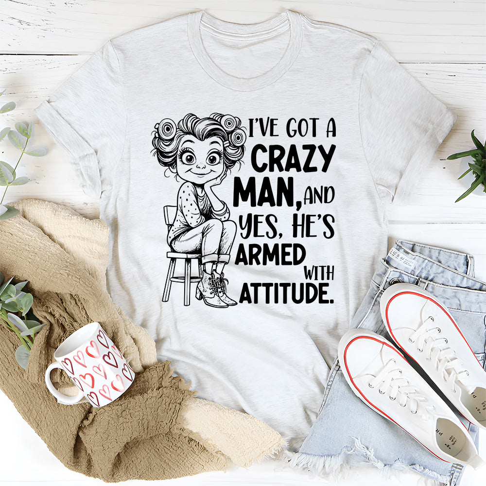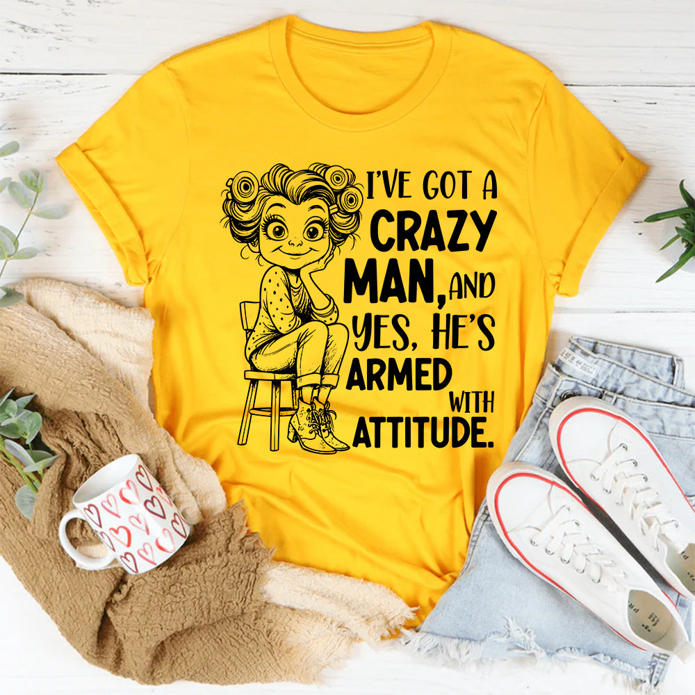 Bold, playful, and full of personality — the “I’ve Got a Crazy Man, and Yes, He’s Armed with Attitude” T-shirt is perfect for anyone who loves a little chaos in their love story. It’s a funny, lighthearted way to show off a relationship that’s anything but boring.