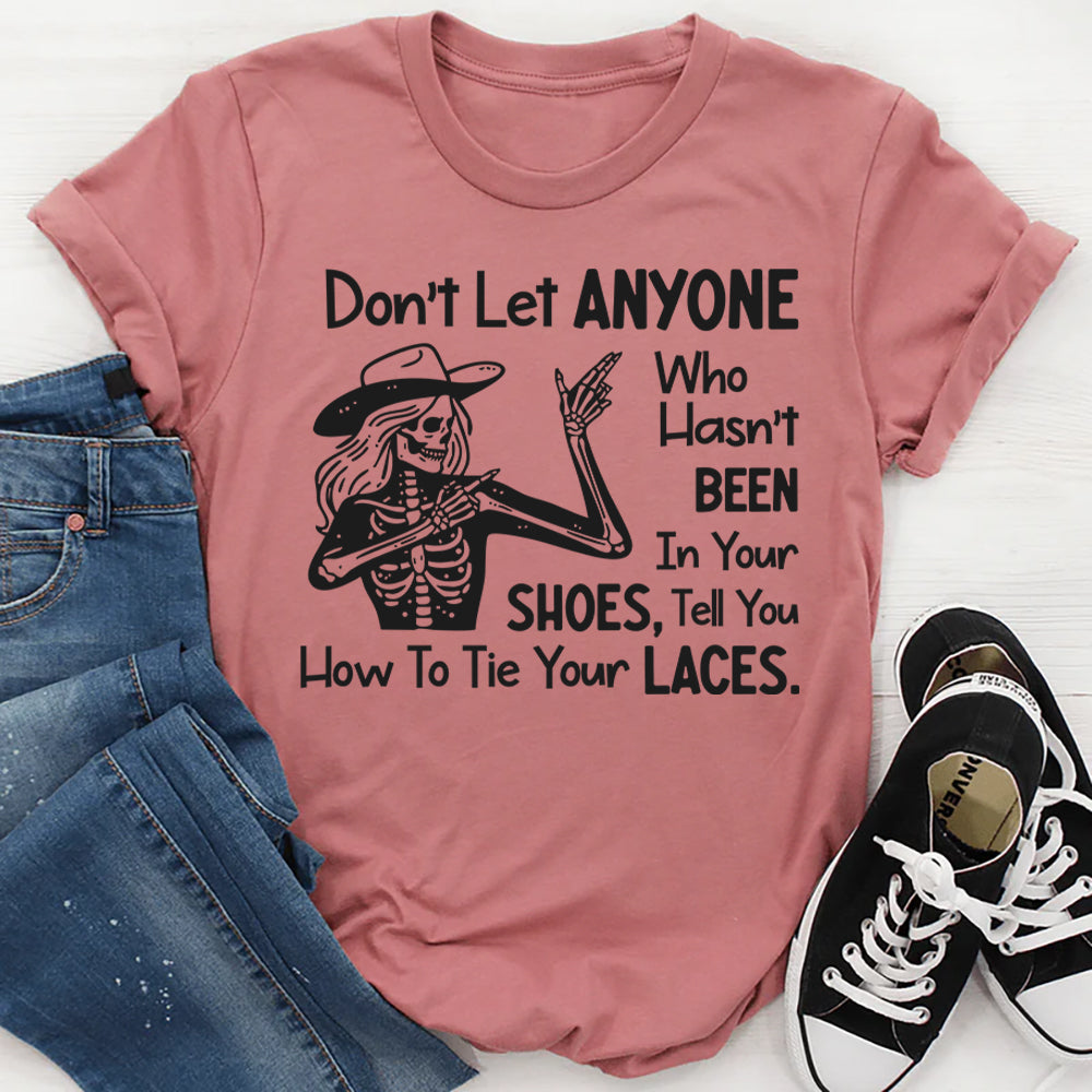 Make a statement with the “Don’t Let Anyone Who Hasn’t Been in Your Shoes Tell You How to Tie Your Laces” t-shirt. This empowering design is all about owning your journey, trusting your experiences, and ignoring unsolicited advice from people who don’t get it.