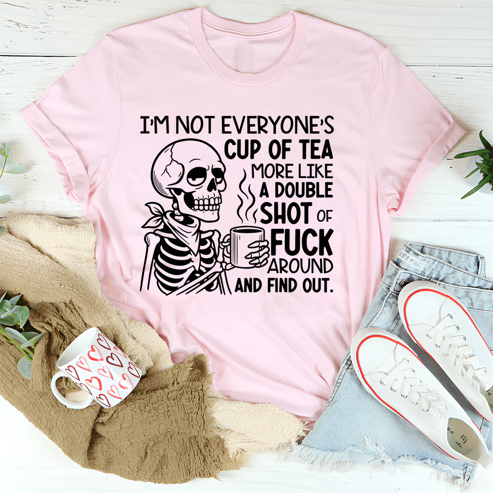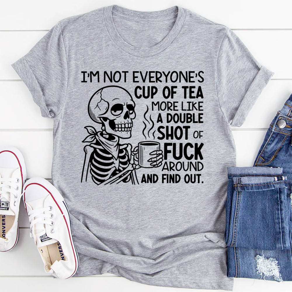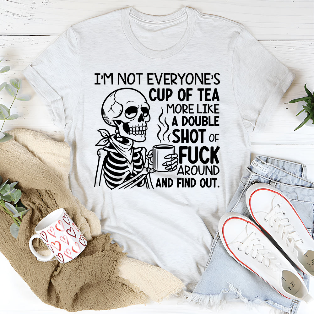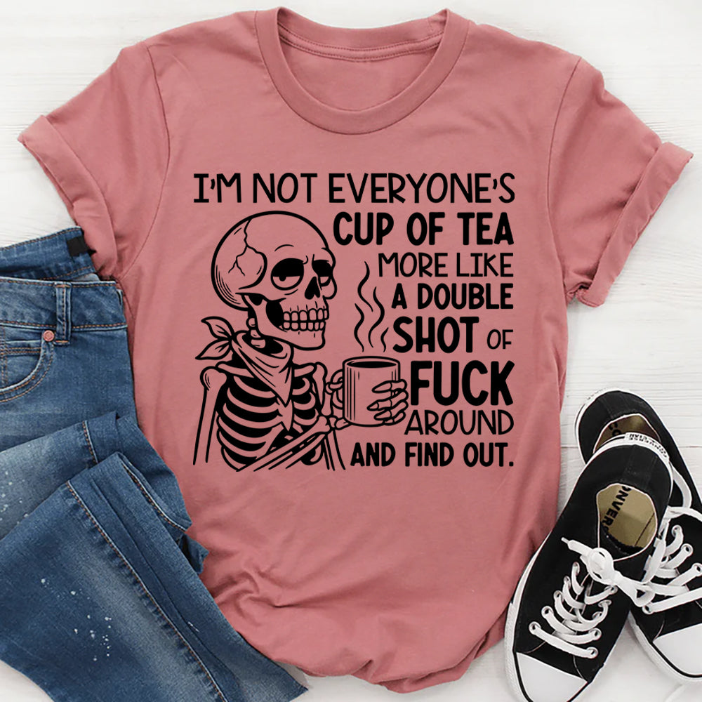 Bold, fierce, and unapologetically intense — the “I’m Not Everyone’s Cup of Tea, More Like a Double Shot of ‘F*ck Around and Find Out’” T-shirt is perfect for those who don’t try to please everyone… and definitely don’t need to. It’s a powerful mix of attitude, confidence, and a warning label wrapped into one statement piece.