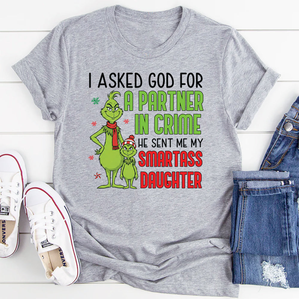 Funny, heartwarming, and full of personality. The “I Asked God for a Partner in Crime, He Sent Me My Smartass Daughter” t‑shirt is perfect for parents who share a special bond with their witty, mischievous daughter. It’s playful, loving, and packed with humor that celebrates family in the most sarcastic way.