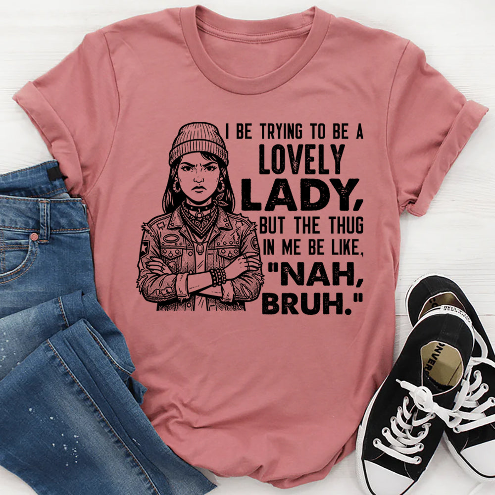 Funny, bold, and full of attitude. The “I Be Trying to Be a Lovely Lady” T-shirt is made for women who balance grace with grit—and aren’t afraid to admit it. It’s a playful nod to that inner voice that refuses to stay quiet, no matter how polished you’re trying to be.