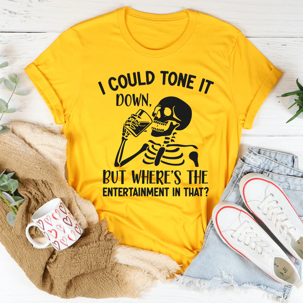 Turn heads and own your confidence with this “I Could Tone It Down, But Where’s the Entertainment in That?” t-shirt! Perfect for anyone who lives loud, laughs hard, and refuses to be boring, this tee is all about celebrating your unapologetic, over-the-top energy.
