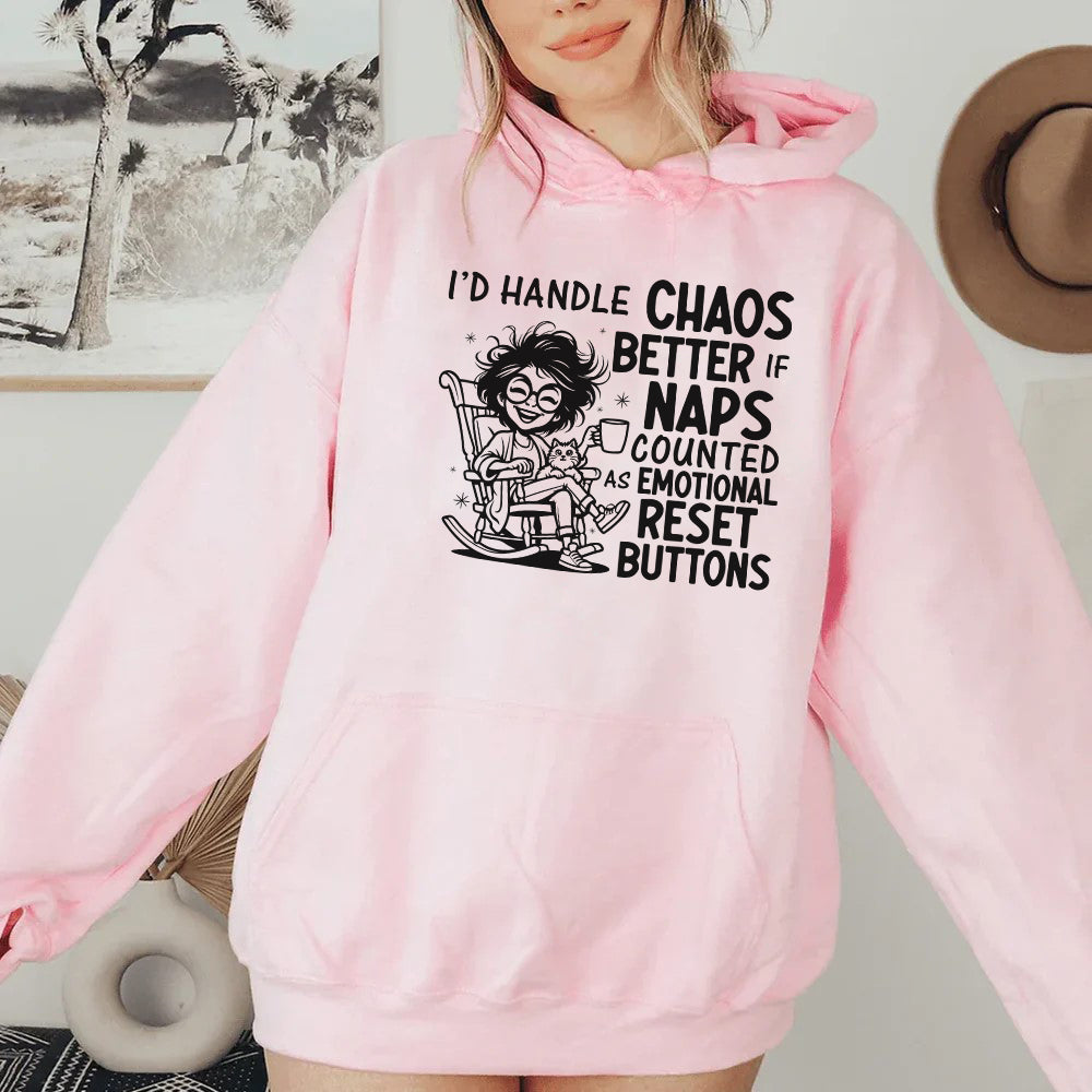 Chaos is inevitable, naps are essential. This “I’d Handle Chaos Better If Naps Counted as Emotional Reset Buttons” hoodie is for anyone whose strategy for surviving life’s madness involves caffeine, comfort, and strategic snoozes. Perfect for overthinkers, multitaskers, and anyone who believes a well-timed nap could solve literally everything.
