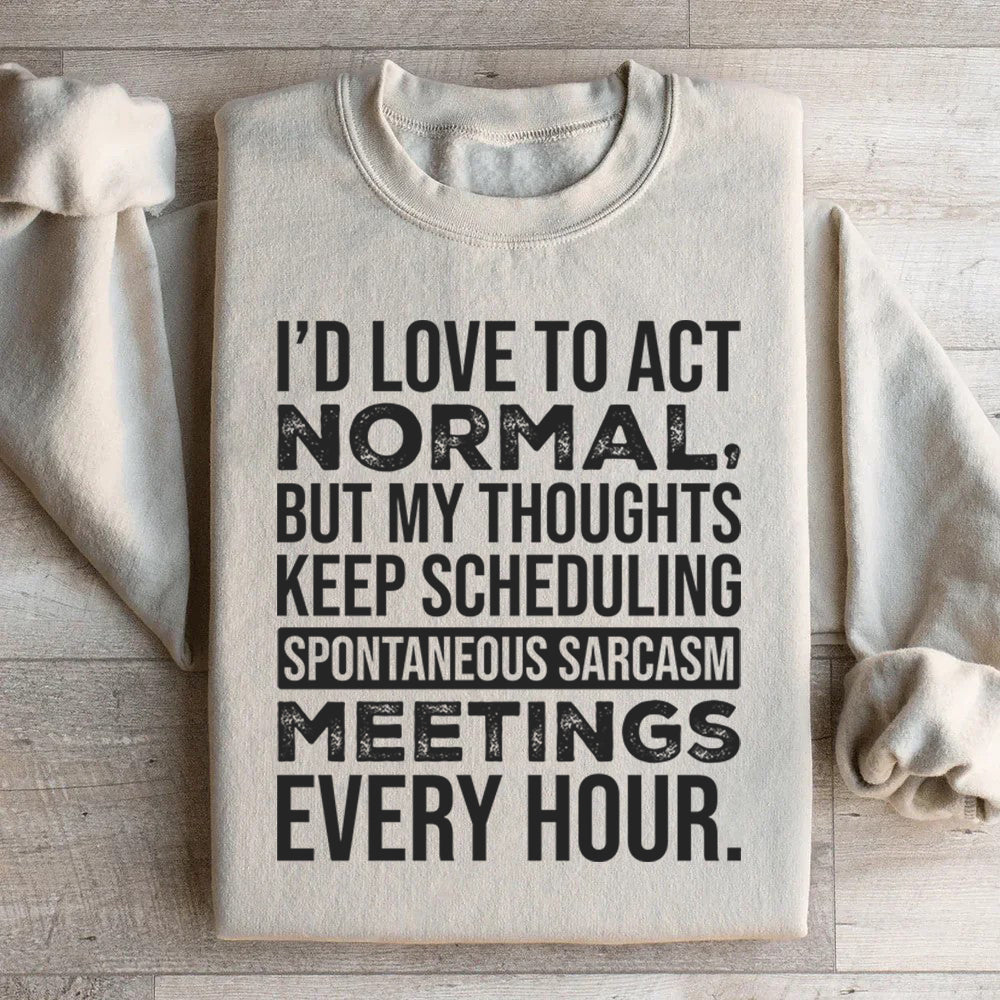 Normal thinking? Never met her. This “I’d Love to Act Normal, But My Thoughts Keep Scheduling Spontaneous Sarcasm Meetings Every Hour” sweatshirt is for the minds that never clock out, filter rarely, and turn every quiet moment into a comedy boardroom.