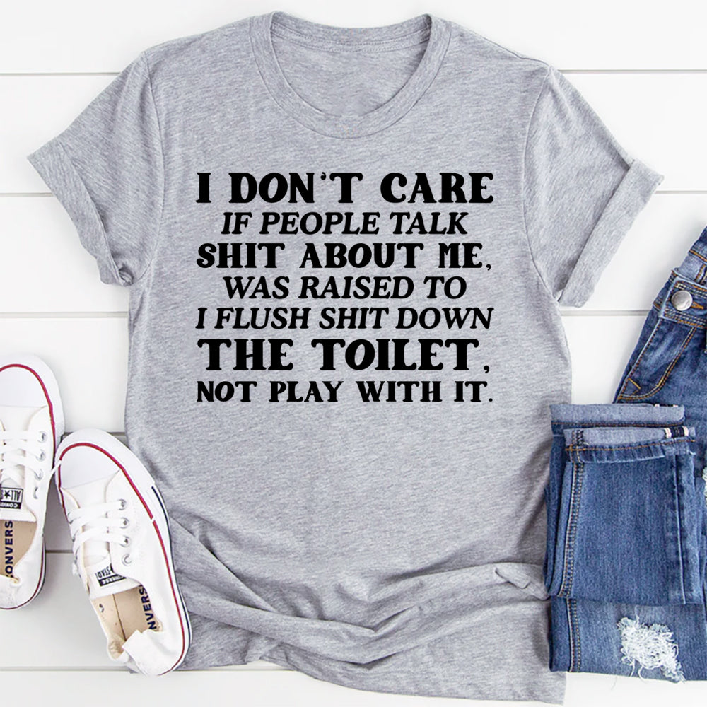 Witty, bold, and unapologetically savage. The “I Don’t Care If People Talk Shit About Me, I Was Raised to Flush Shit Down the Toilet, Not Play With It” t‑shirt is a hilarious declaration of zero tolerance for drama. Perfect for anyone who values their peace, keeps it real, and handles nonsense with a side of humor.