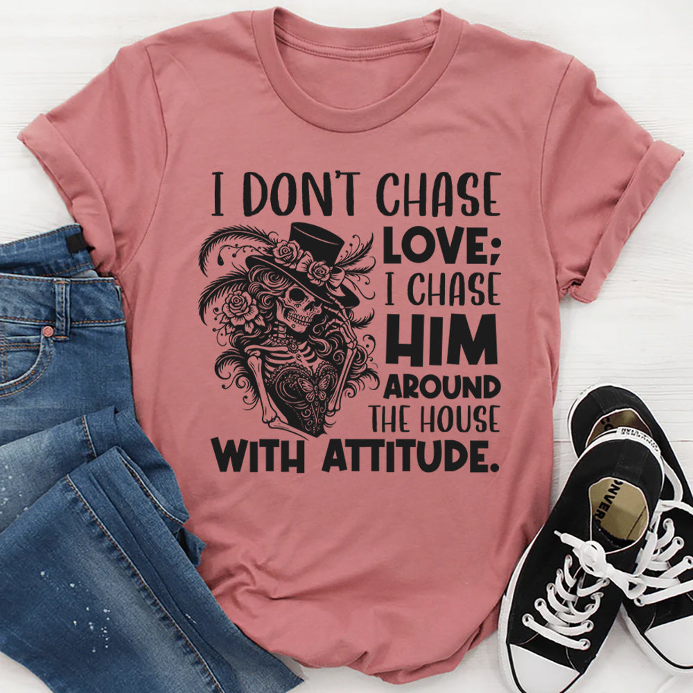 Playful, bold, and adorably dramatic — this “I Don’t Chase Love; I Chase Him Around the House With Attitude” t-shirt is for the ones who show affection with a little sass and a whole lot of personality. Perfect for partners who love fiercely, joke loudly, and believe romance should always come with humor (and maybe a few dramatic eye-rolls).
