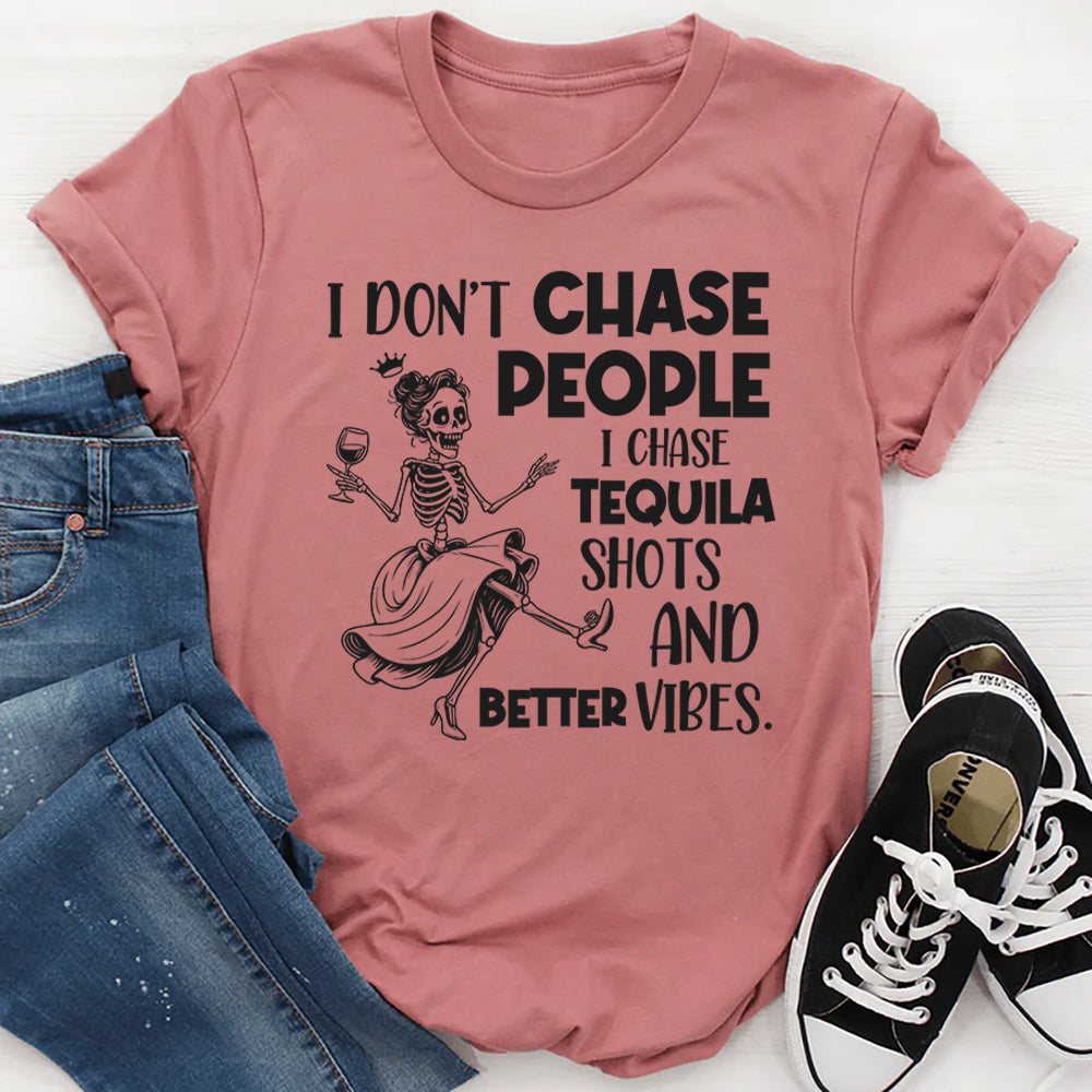 Add a splash of fun and zero-chase energy to your wardrobe with this “I Don’t Chase People — I Chase Tequila Shots and Better Vibes” t-shirt! Perfect for free-spirited souls, good-vibe seekers, and anyone who knows life’s too short to run after anyone except the bartender, this tee brings attitude, humor, and weekend energy all in one.