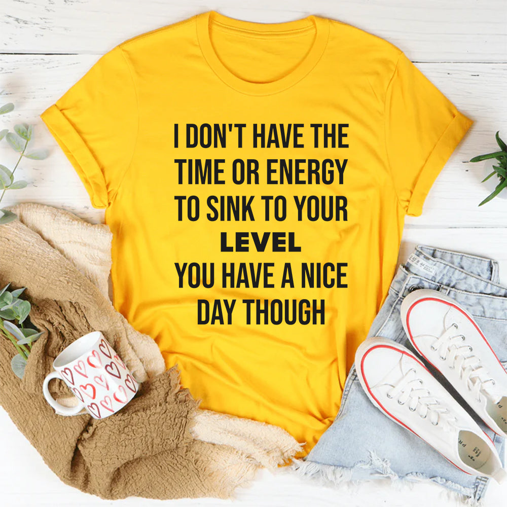 Stay classy while shutting down negativity with this “I Don’t Have the Time or Energy to Sink to Your Level, You Have a Nice Day Though” t-shirt. Perfect for those who prefer peace over pettiness, this tee delivers a sarcastic yet polite clapback in style.