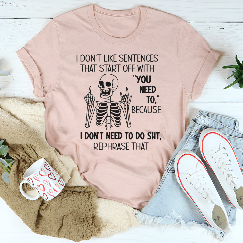 Make your boundaries crystal clear with the “I Don’t Like Sentences That Start Off With ‘You Need To’ Because I Don’t Need To Do Sh*t Rephrase That” t-shirt. Perfect for anyone who’s tired of being told what to do, this shirt delivers attitude with a hilarious twist.