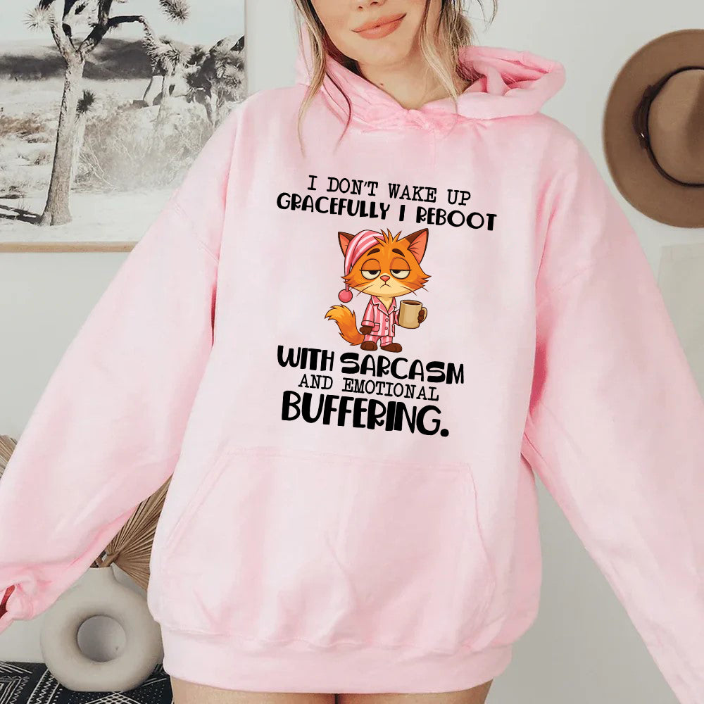 A little glitchy, a little sassy, and entirely relatable — this “I Don’t Wake Up Gracefully, I Reboot With Sarcasm and Emotional Buffering” hoodie is for the ones who start their mornings like a system update: slow, chaotic, and full of personality.