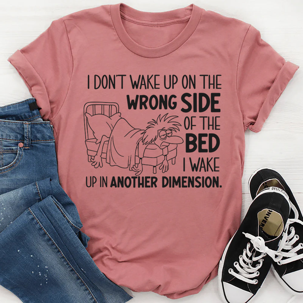 Start your day with a laugh in this “I Don’t Wake Up on the Wrong Side of the Bed — I Wake Up in Another Dimension” t-shirt! Perfect for those mornings when you feel like reality hit the snooze button, this tee captures your chaotic energy and sense of humor perfectly.