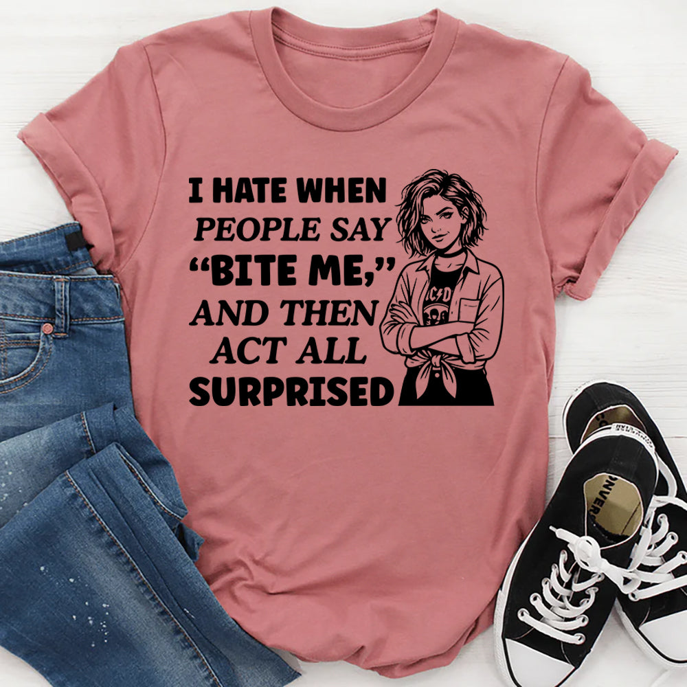 Funny, sarcastic, and unapologetically literal. The “I Hate When People Say ‘Bite Me,’ and Then Act All Surprised” t-shirt is made for those who take words at face value and humor a little too seriously—in the best way. It’s a clever twist on sarcasm, boundaries, and saying exactly what you mean.