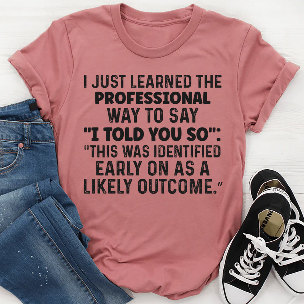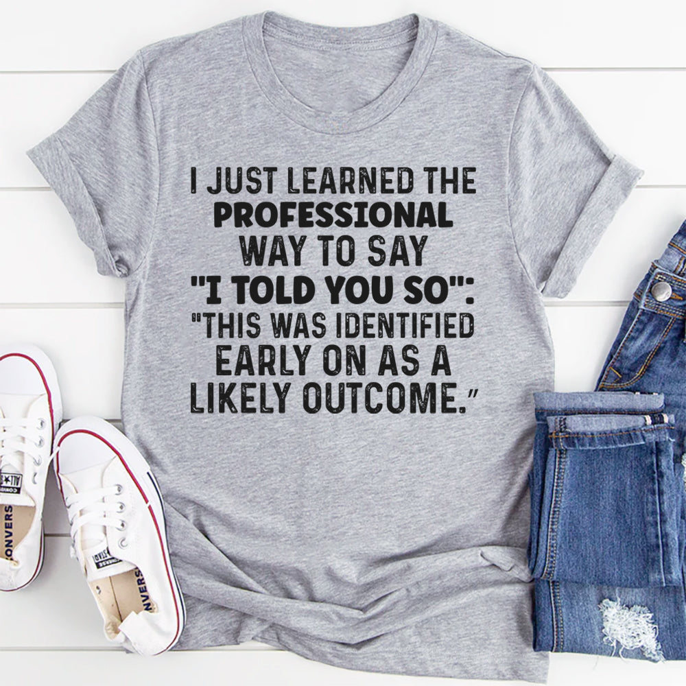 Show off your clever side with the “I Just Learned a Professional Way to Say I Told You So: ‘This Was Identified Early On as a Likely Outcome’” t-shirt. Perfect for anyone who loves a sarcastic twist on corporate lingo, this design blends humor with a touch of smug satisfaction.