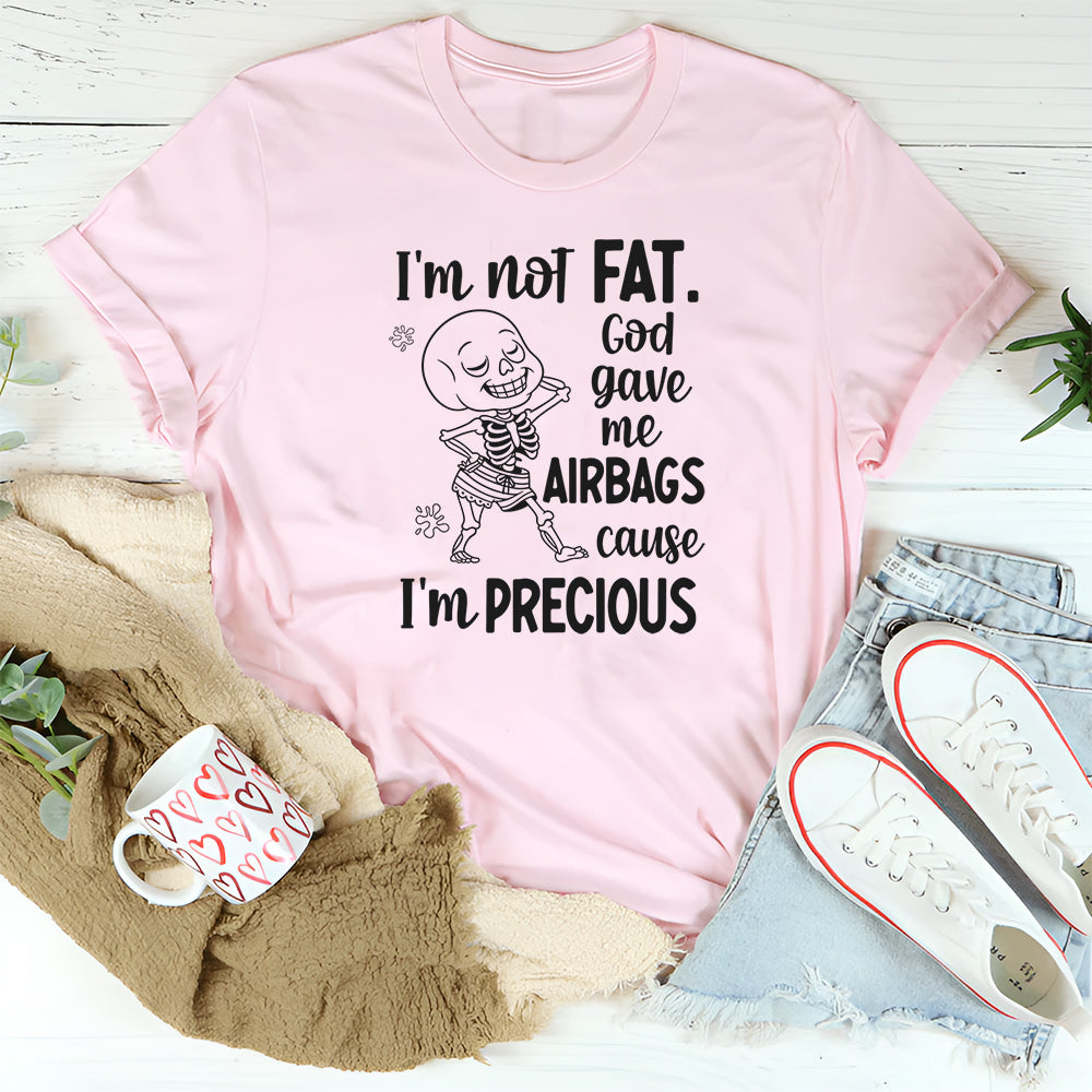 Add humor and confidence to your wardrobe with the “I’m Not Fat, God Gave Me Airbags ’Cause I’m Precious” t-shirt. A lighthearted design that celebrates self-love and positivity, this shirt is perfect for anyone who knows how to laugh at life while embracing their uniqueness.