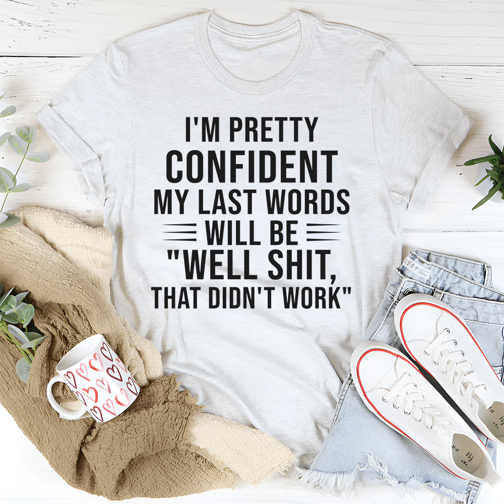 Embrace your dark humor with the “I’m Pretty Confident My Last Words Will Be ‘Well Shit, That Didn’t Work’” t-shirt. Perfect for anyone who meets life’s challenges with sarcasm, this tee delivers laughs while keeping your style casual and cool.