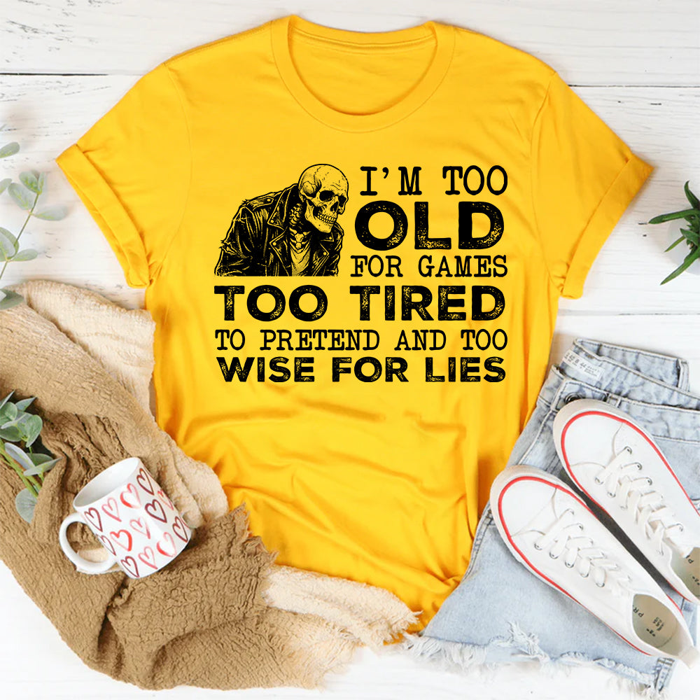 Bold, honest, and unapologetically relatable. The “I’m Too Old for Games, Too Tired to Pretend, and Too Wise for Lies” t-shirt delivers straight-talk humor with a confident edge. Perfect for anyone who’s reached the stage of life where honesty matters more than impressing anyone else.
