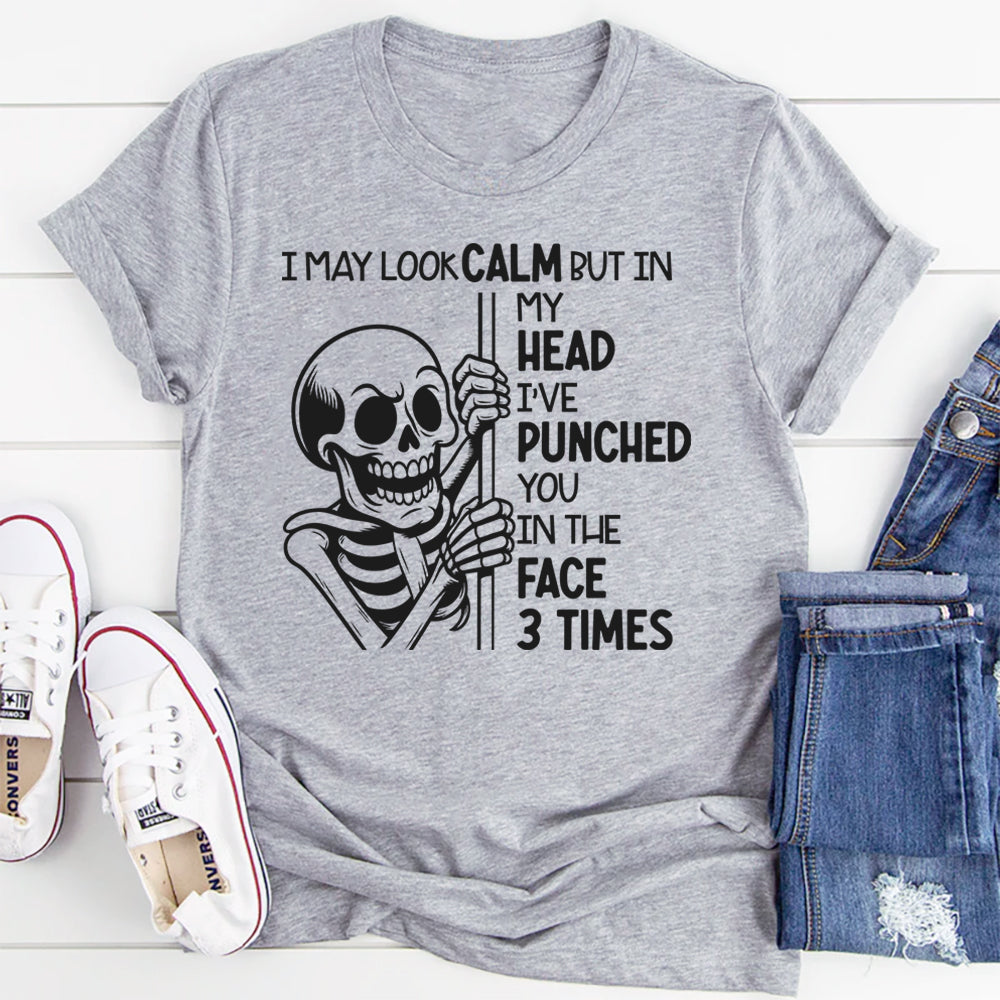 Stay cool on the outside and savage on the inside with the “I May Look Calm But In My Head I’ve Punched You In The Face 3 Times” t-shirt. Perfect for anyone who smiles through the chaos while their inner monologue does the heavy lifting, this tee mixes dry humor with a cheeky warning.