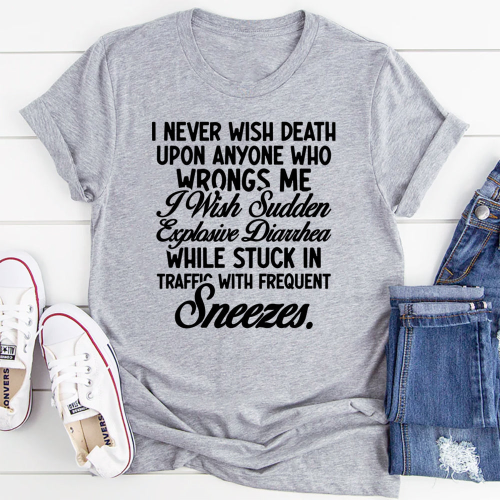 Darkly funny, petty in the best way, and wildly relatable. The “I Never Wish Death Upon Anyone Who Wrongs Me — I Wish Sudden Explosive Diarrhea While Stuck in Traffic With Frequent Sneezes” t-shirt delivers savage humor with a creative twist. It’s the ultimate expression of sarcastic revenge—harmless, hilarious, and painfully specific.