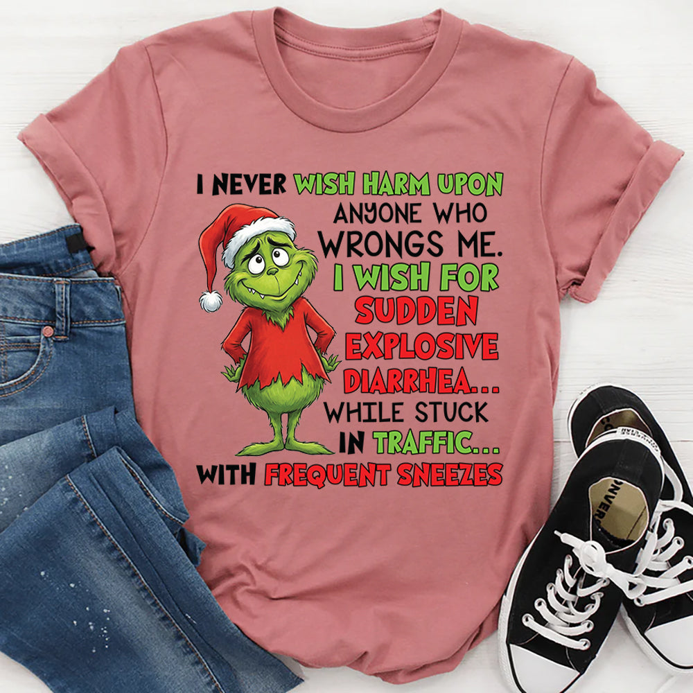 Bold, hilarious, and delightfully savage, the “I Never Wish Harm Upon Anyone Who Wrongs Me… I Wish for Sudden Explosive Diarrhea While Stuck in Traffic with Frequent Sneezes” T-shirt is perfect for those who enjoy a darkly funny twist on karma. It’s a cheeky way to say, “I forgive—but I also hope life gives you a little chaos.”