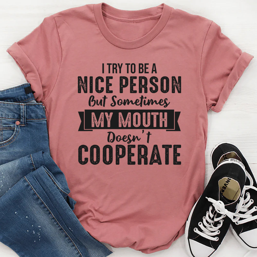Keep it real with the “I Try to Be a Nice Person But Sometimes My Mouth Doesn’t Cooperate” t-shirt. Perfect for those who mean well but can’t always filter their words, this tee delivers honesty with a side of humor.