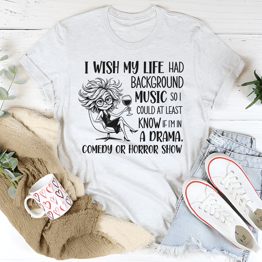 Ever wish life came with a soundtrack so you’d know what’s coming next? This “I Wish My Life Had Background Music So I Could At Least Know If I’m In a Drama, Comedy, or Horror Show” t-shirt perfectly sums up the chaos of everyday life.