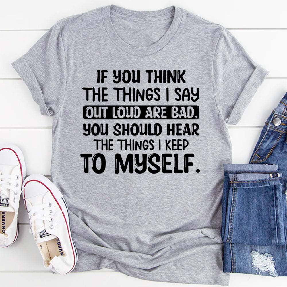 Witty, bold, and unapologetically real. The “If You Think the Things I Say Out Loud Are Bad, You Should Hear the Things I Keep to Myself” t‑shirt is a playful declaration of attitude and unfiltered honesty. Perfect for anyone with a sharp tongue, a mischievous mind, and a knack for keeping thoughts just edgy enough.