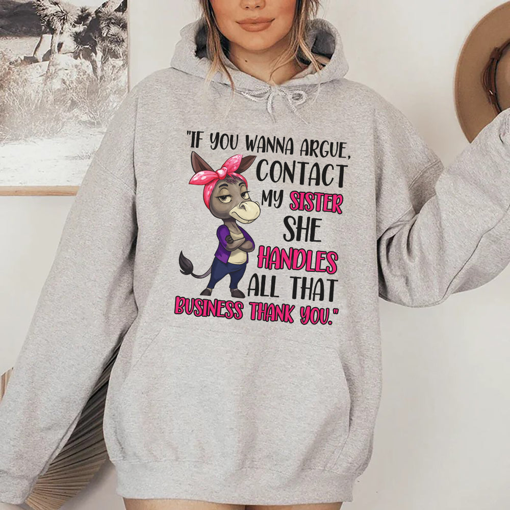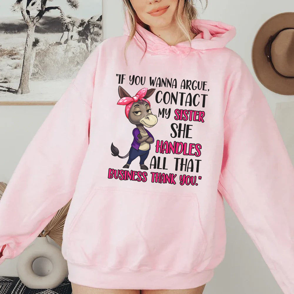 Funny, bold, and effortlessly sassy this “If You Wanna Argue, Contact My Sister, She Handles All That Business, Thank You” hoodie is for anyone who knows how to delegate drama with style. It’s the perfect mix of humor, family pride, and just enough attitude to keep everyone entertained.