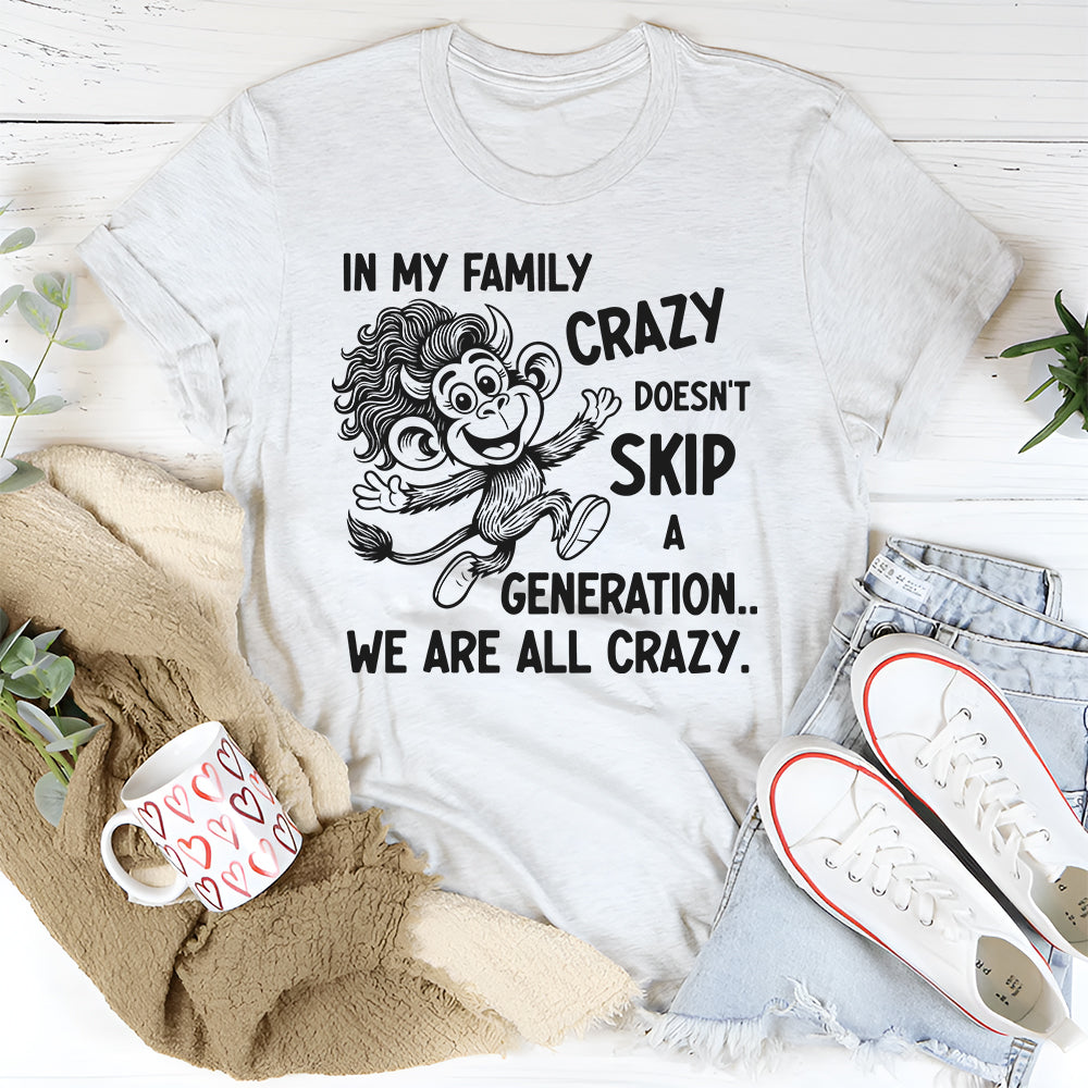 Show off your family pride (and humor) with the “In My Family Crazy Doesn’t Skip a Generation, We Are All Crazy” t-shirt. A bold and funny design that celebrates the wild, quirky, and loveable side of family life, this shirt is perfect for anyone who knows a little crazy runs deep in their bloodline.