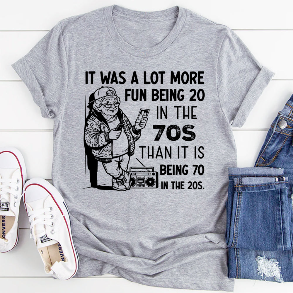 Witty, nostalgic, and unapologetically honest. The “IT WAS A LOT MORE FUN BEING 20 IN THE 70S THAN IT IS BEING 70 IN THE 20S” t-shirt is a humorous tribute to the good old days and a playful nod to the realities of aging. It’s perfect for anyone with a sharp sense of humor and a love for reminiscing.