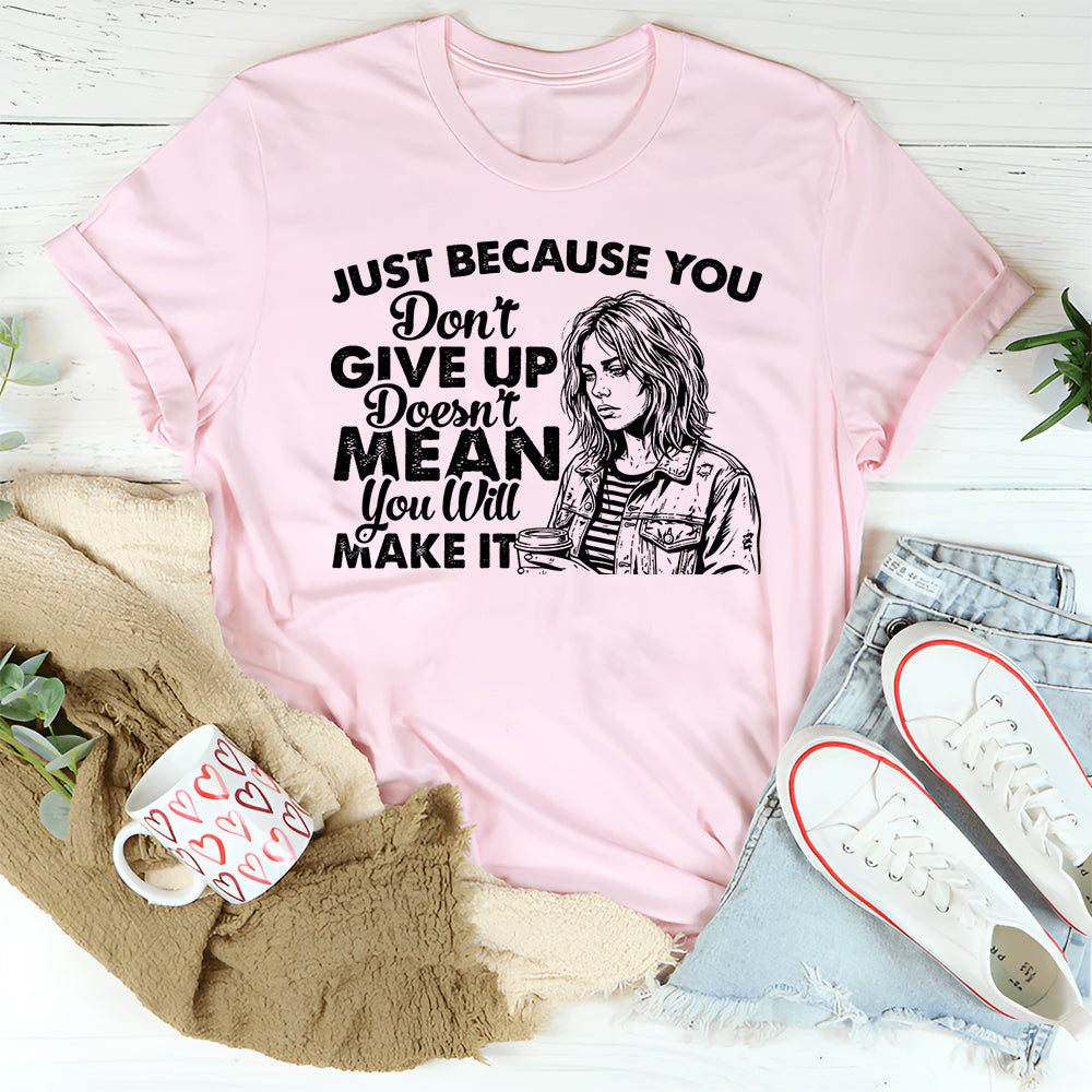Honest, thought-provoking, and unapologetically real. The “Just Because You Don’t Give Up Doesn’t Mean You Will Make It” T-shirt is made for those who embrace perseverance—but aren’t afraid to acknowledge life’s harsh truths. It’s a reminder that resilience is admirable, even when outcomes aren’t guaranteed.