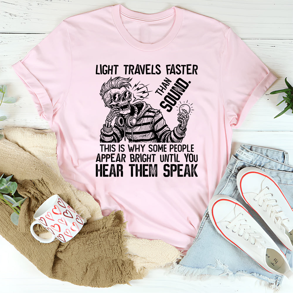 Clever, sarcastic, and hilariously relatable. The “Light Travels Faster Than Sound” T-shirt is made for anyone who appreciates a smart joke with a little edge. It’s the perfect way to call out those who seem brilliant…until they start talking.