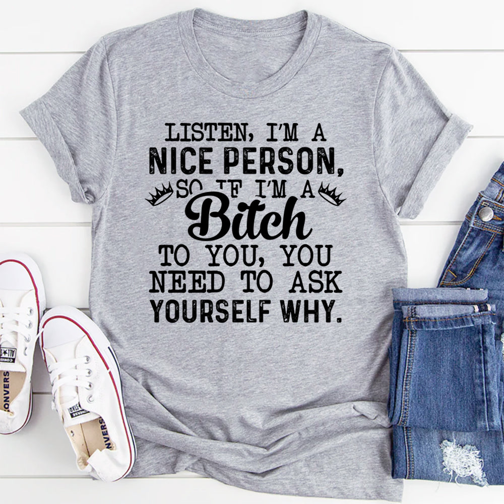 Witty, bold, and unapologetically honest. The “Listen, I’m a Nice Person — So If I’m a Bitch to You, You Need to Ask Yourself Why” t-shirt is for those who know their character and aren’t afraid to set boundaries. It delivers sharp humor with a confident edge, making it clear that respect is a two-way street.