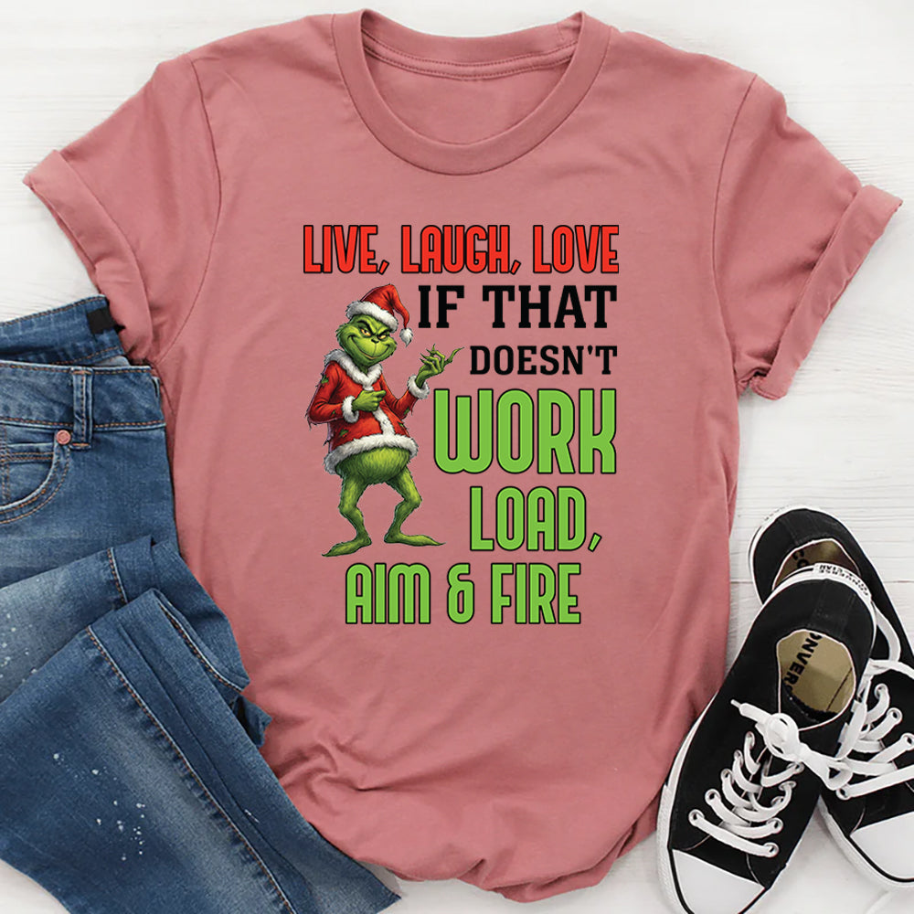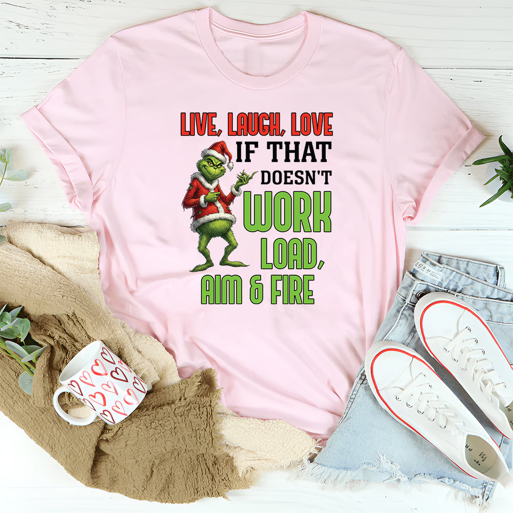 Bold, funny, and unapologetically sassy. The “Live, Laugh, Love — If That Doesn’t Work, Load, Aim & Fire” t-shirt is perfect for anyone who balances a sense of humor with a no-nonsense attitude. It’s a playful twist on the classic motto, mixing positivity with a dash of dark sarcasm.
