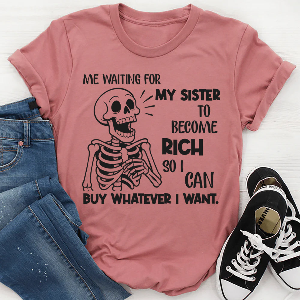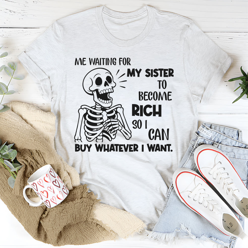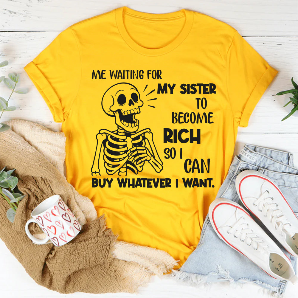 Show off your sibling goals with the “Me Waiting for My Sister to Become Rich So I Can Buy Whatever I Want” t-shirt. Perfect for anyone who knows being the supportive sibling comes with perks, this tee mixes family love with a hilarious twist.