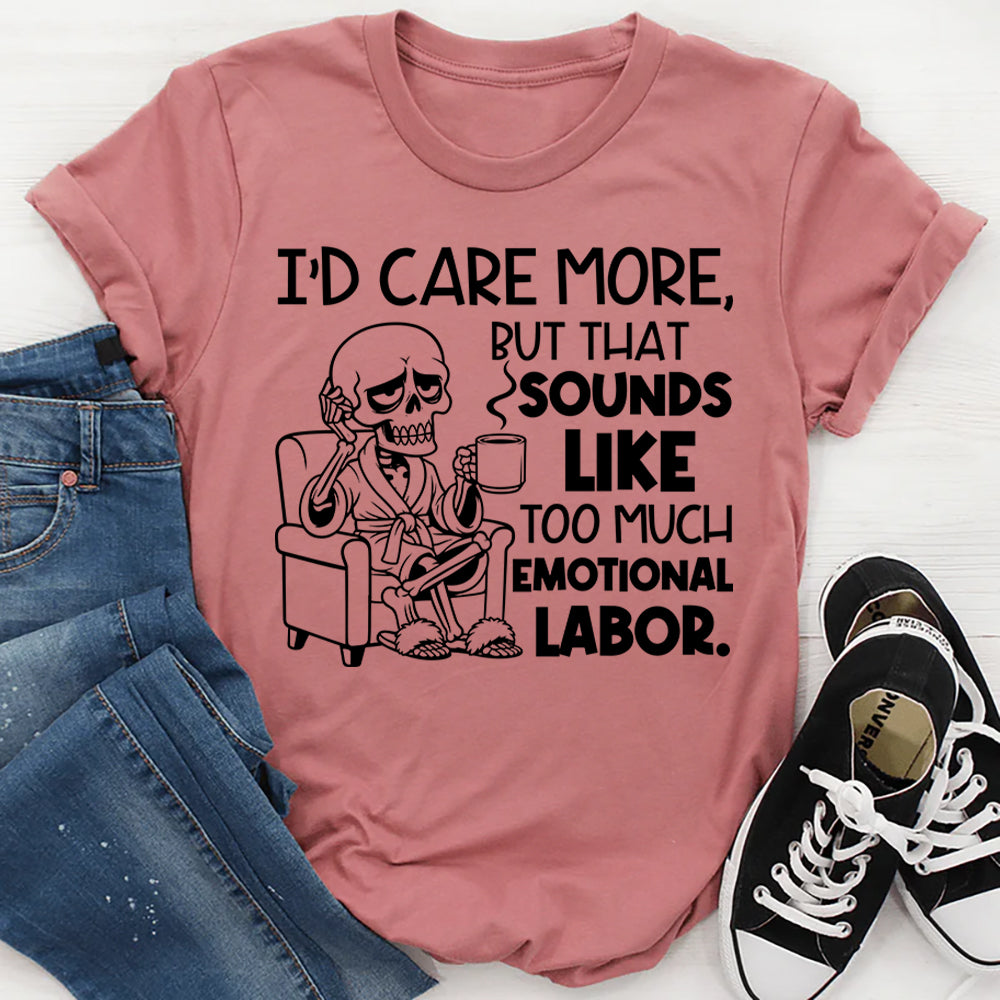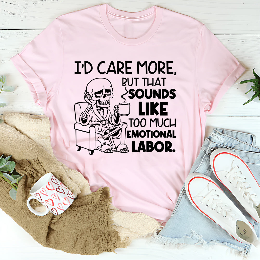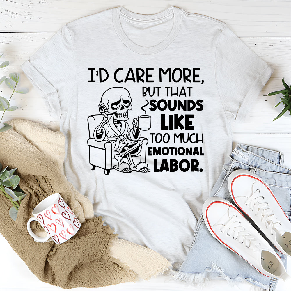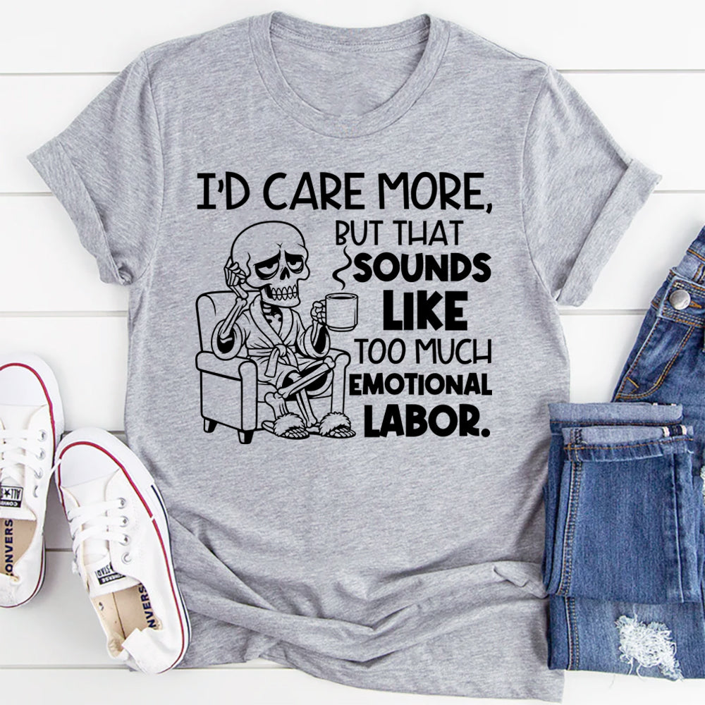 Funny, dry, and effortlessly relatable — the “I’d Care More, But That Sounds Like Too Much Emotional Labor” T-shirt is perfect for anyone who has mastered the art of selective energy. It’s a witty take on modern life, boundaries, and saving your effort for things that actually matter.