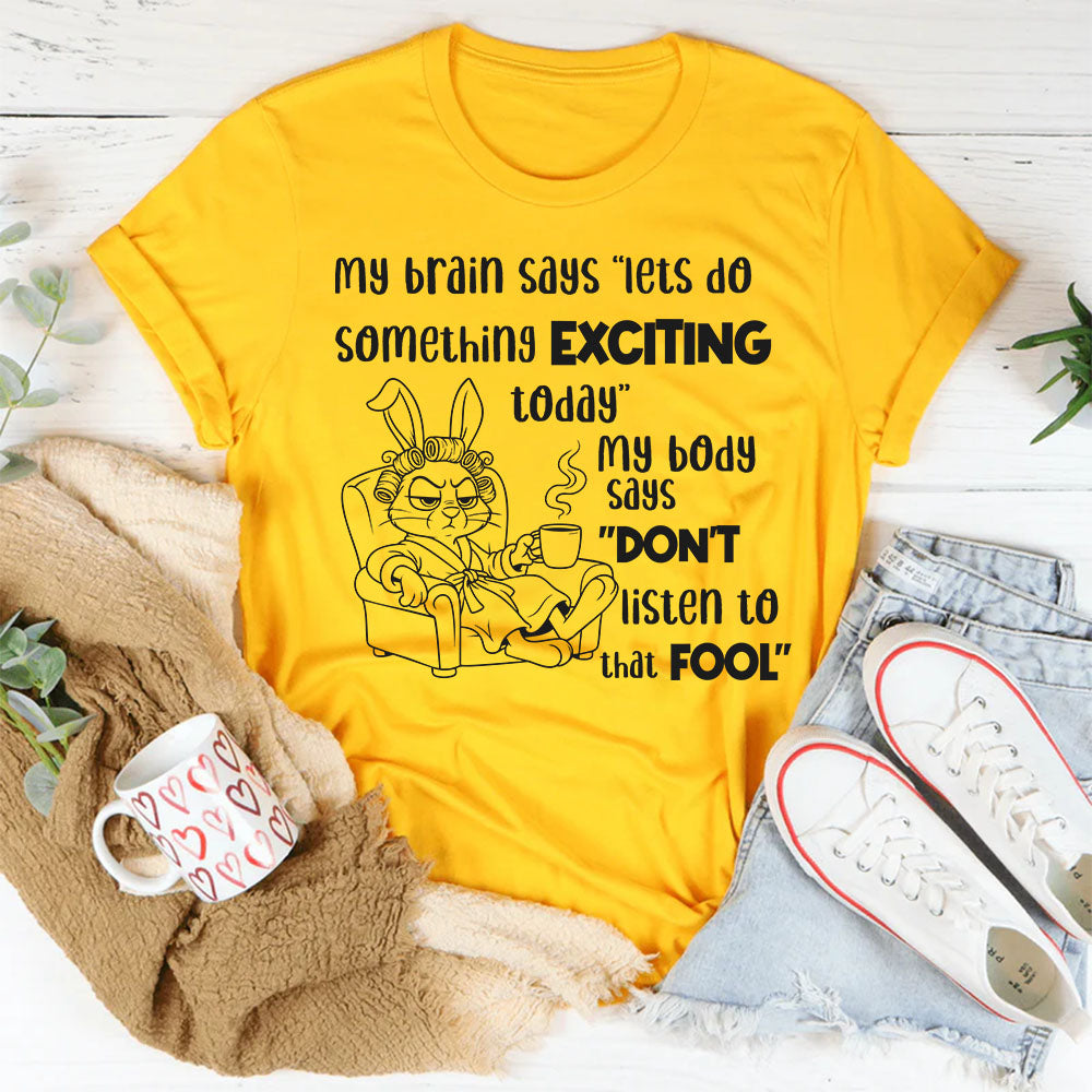 Ambition vs. reality. The “My Brain Says ‘Let’s Do Something Exciting Today’ — My Body Don’t Listen to That Fool” t-shirt is perfect for anyone who dreams big but naps bigger. Equal parts hilarious and true, it’s the ultimate tee for people whose energy never quite matches their ideas.