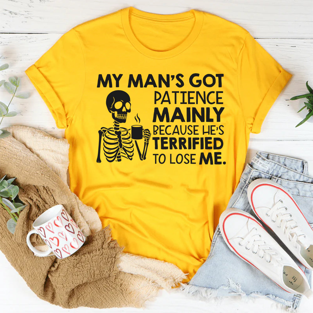 Show off your bold love energy with this “My Man’s Got Patience — Mainly Because He’s Terrified to Lose Me” t-shirt! Perfect for strong women, sassy partners, and anyone who knows they’re a prize worth protecting, this tee brings humor, attitude, and a little relationship power to every look.