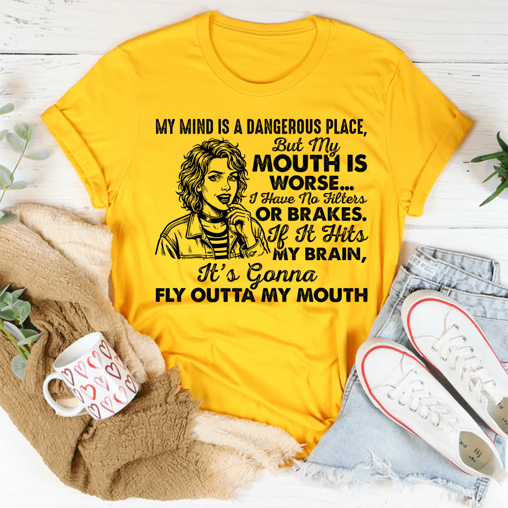 Funny, unapologetic, and a little too accurate. The “My Mind Is a Dangerous Place, But My Mouth Is Worse” T-shirt is made for people who think fast, speak faster, and rarely hit pause. It’s a humorous warning label for anyone with zero filters and even fewer regrets.