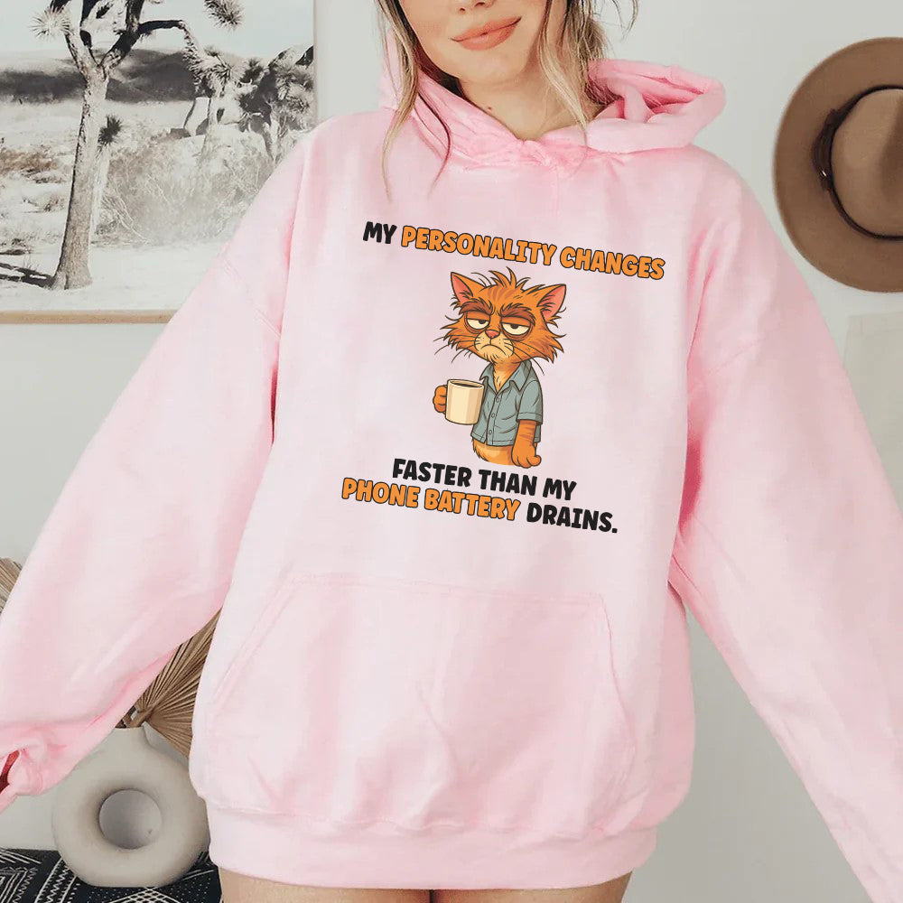 Unpredictable, lively, and unapologetically dynamic — this “My Personality Changes Faster Than My Phone Battery Drains” hoodie is made for the ones who keep life interesting just by being themselves. Your energy shifts, your mood swings, and your charisma is always in motion — like a phone running at 1% and still surviving the day.