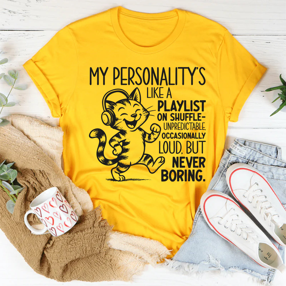 Wild, random, and never stuck on one vibe — this “My Personality’s Like a Playlist on Shuffle” t-shirt is for the souls who jump from calm to chaos, soft girl to hype mode, romance to rage anthem… all before lunch. If you're unpredictable in the most entertaining way, this tee is your energy in fabric form.