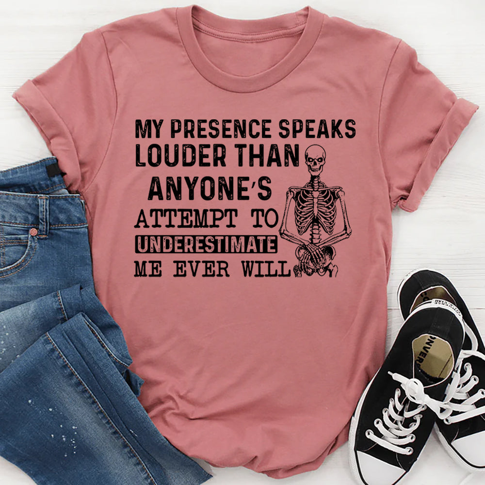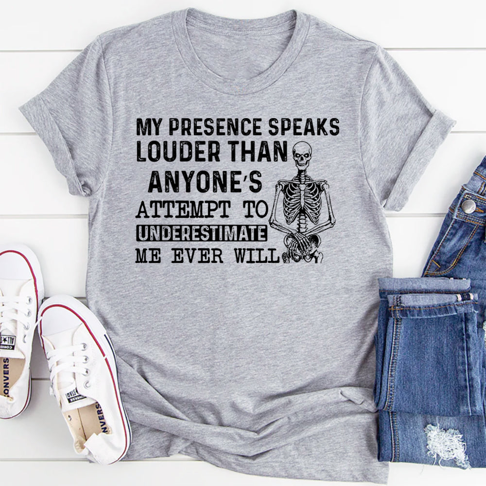 Command respect with the “My Presence Speaks Louder Than Anyone’s Attempt to Underestimate Me Ever Will” T-shirt. Perfect for confident, unapologetic individuals who know their worth and refuse to be overlooked, this tee turns self-assurance into a bold statement.