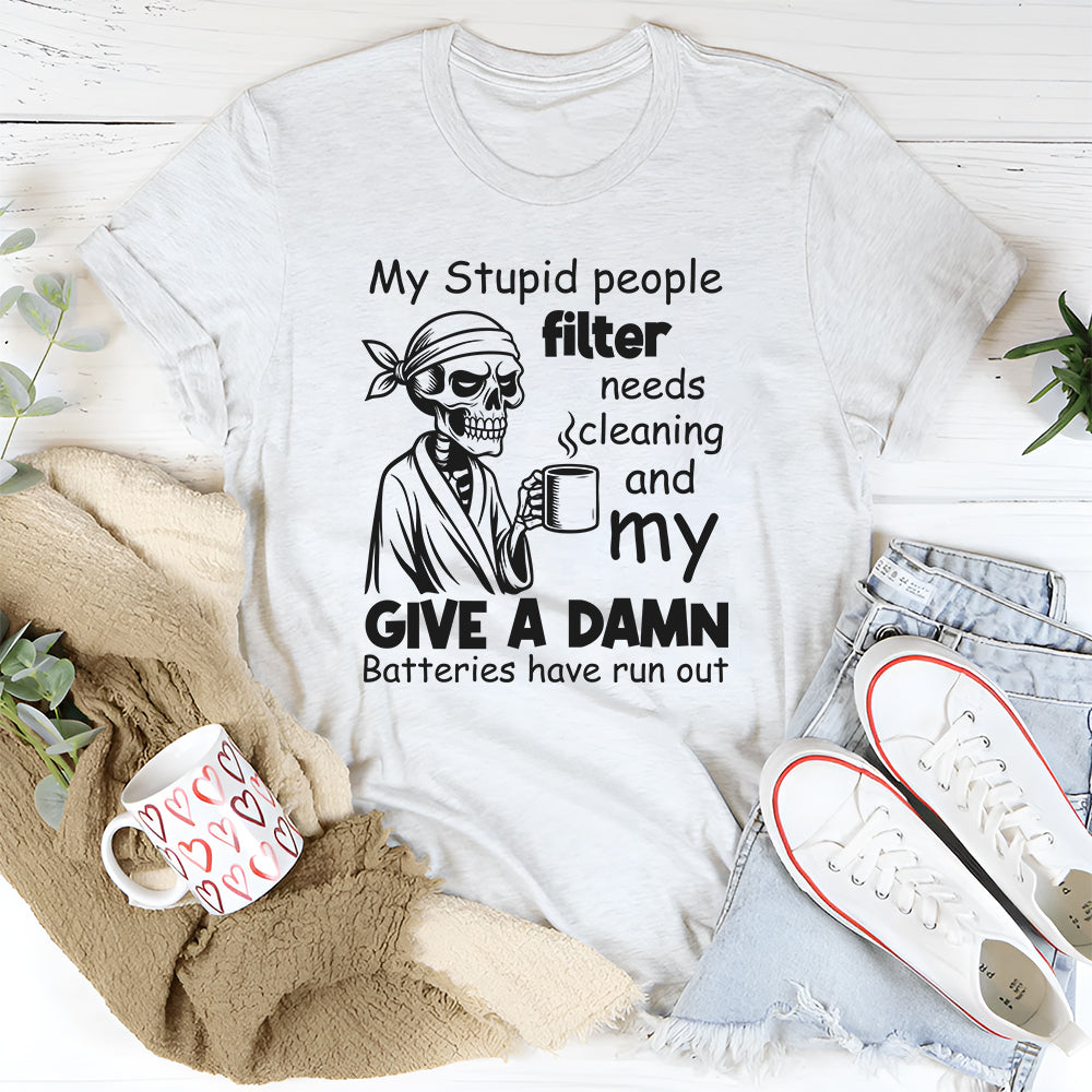 Keep it real with the “My Stupid People Filter Needs Cleaning and My Give a Damn Batteries Have Run Out” t-shirt. Perfect for anyone whose patience is running low, this tee says what you’re really thinking with a dose of sharp humor.