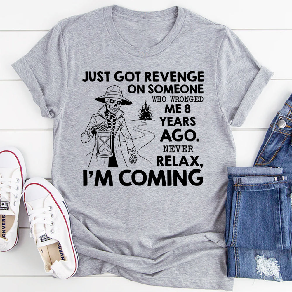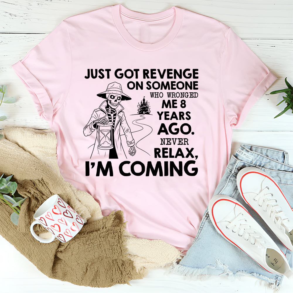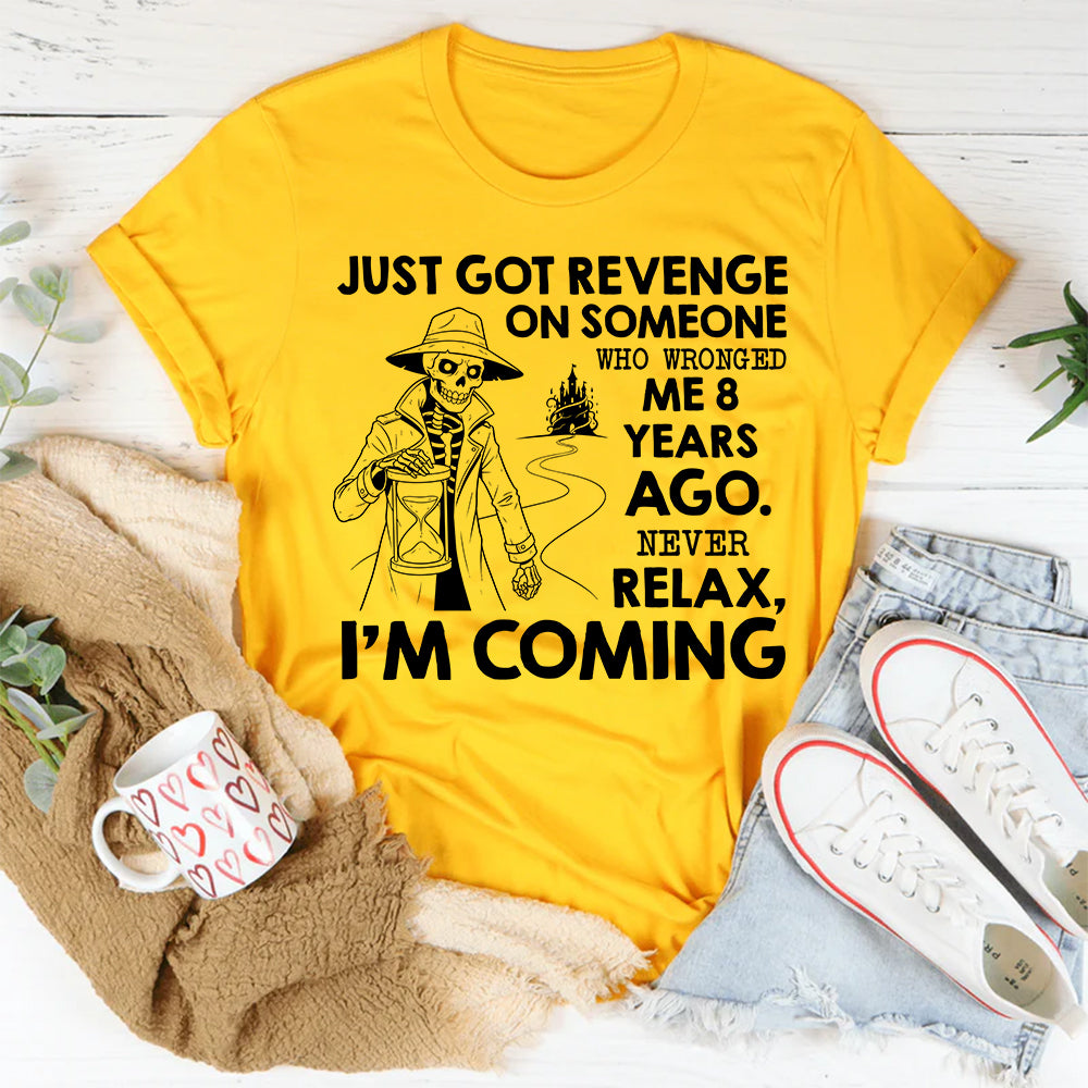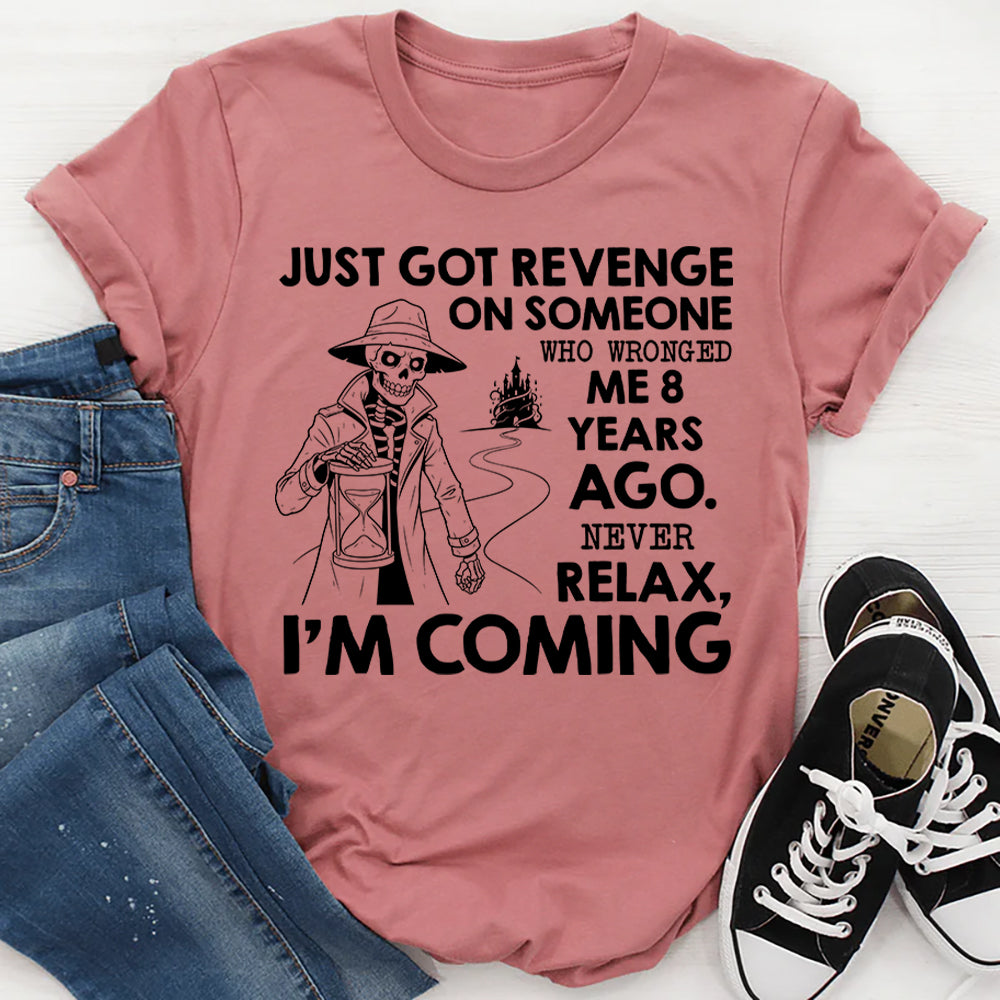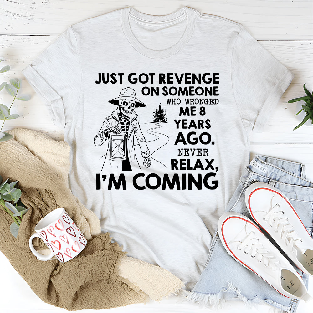 Bold, sarcastic, and hilariously over‑dramatic, the “Just Got Revenge on Someone Who Wronged Me 8 Years Ago. Never Relax, I’m Coming” T‑shirt is for people who play the long game… mostly in their head. It’s all about dark humor, petty thoughts, and laughing at the fact that some grudges age like fine wine.